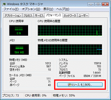 メモリの増設方法を教えてください。(新しいウィンドウで表示) - 「物理メモリ使用量」の確認が終わったら、「×」ボタンをクリックし、「リソース モニタ」を閉じます。