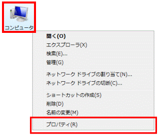 - 「コンピュータ」を右クリックし、表示されるメニューから「プロパティ」をクリックします。