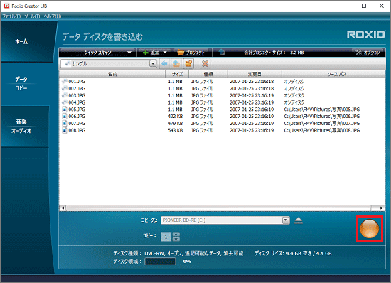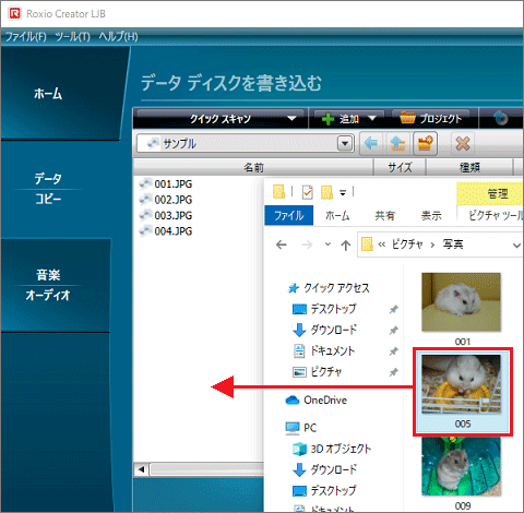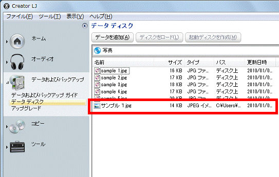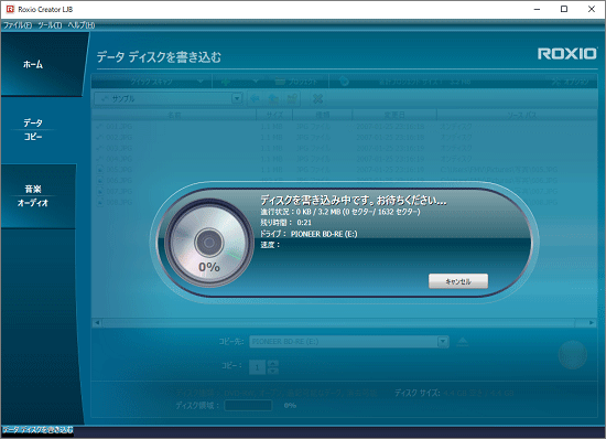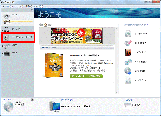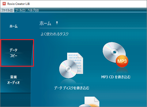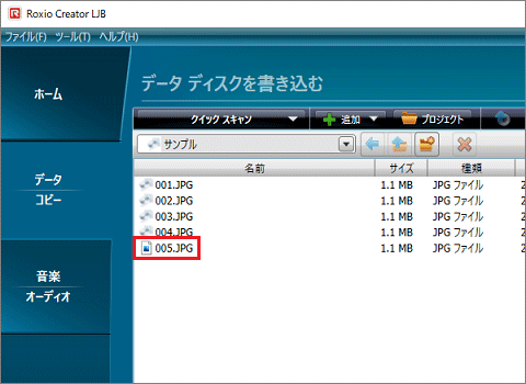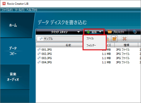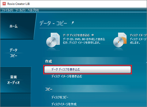Roxio Creator LJ / LJBでは、「データ / コピー」の「データディスクを書き込む」からデータを追記できます。