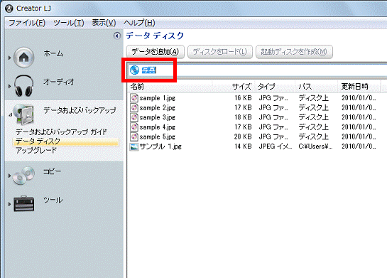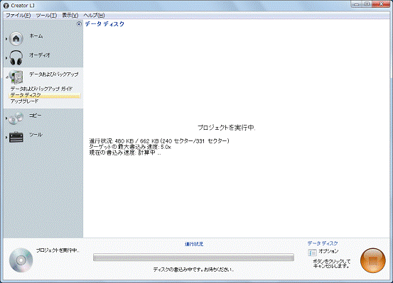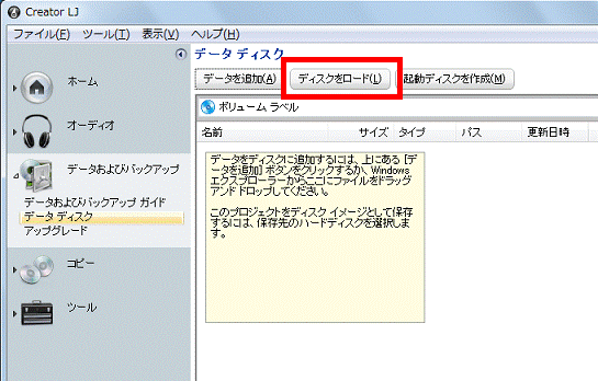 - 「作成」の「データディスクを書き込む」ボタンをクリックします。