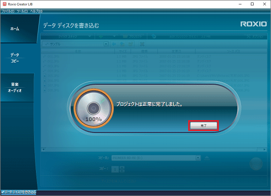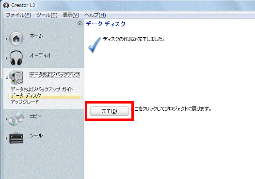 ディスクを取り出し、「完了」ボタンをクリックします。