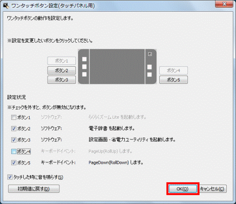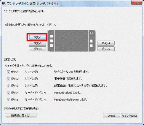 - 「スタート」ボタン→「すべてのプログラム」→「ワンタッチボタン設定(タッチパネル用)」→「ワンタッチボタン設定(タッチパネル用)」の順にクリックします。
