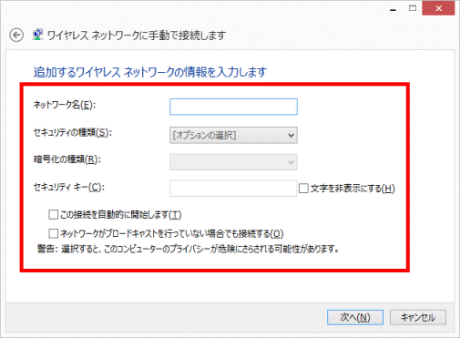 - 「追加するワイヤレスネットワークの情報を入力します」と表示されます。