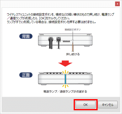 - 「ワイヤレスTVユニットの接続設定ボタンを、楊枝などの細い棒状のもので押し続け、電源ランプ/通信ランプが点滅したら、[OK]をクリックしてください。」と表示されます。