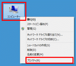 - 「コンピューター」を右クリックし、表示されるメニューから、「プロパティ」をクリックします。