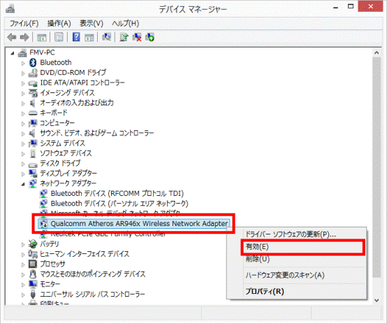 - 「Qualcomm Atheros AR946x Wireless Network Adapter」を右クリックし、表示されるメニューから「有効」クリックします。