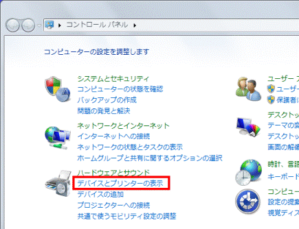 - 「ハードウェアとサウンド」の「デバイスとプリンターの表示」をクリックします。
