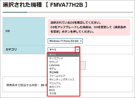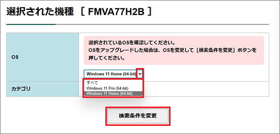 表示されていない場合は、「V」をクリックし、表示される一覧から現在のOSをクリックして、「検索条件を変更」ボタンをクリックします。