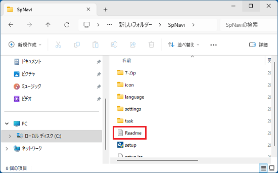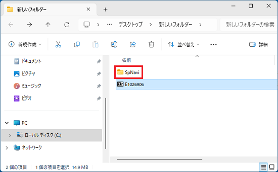 (作成されたフォルダーが「SpNavi」の場合の例)