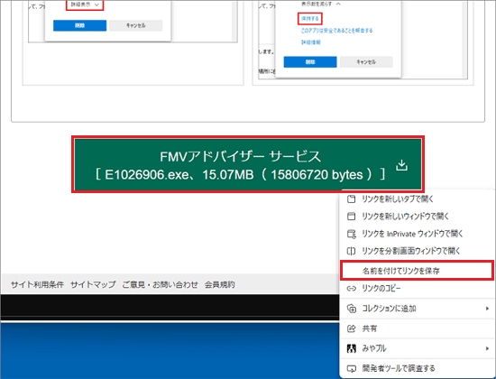 4. 「ダウンロードファイル」内にあるリンクを右クリックし、表示されるメニューから「名前を付けてリンクを保存」、または「対象をファイルに保存」をクリックします。