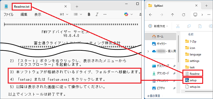 (インストール手順が記載されているファイルが「Readme」、探すファイルが「setup」の場合の例)