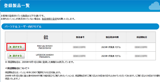 「登録製品一覧」と表示されたら、仕様を確認したい機種の「選択する」ボタンをクリックします。