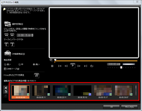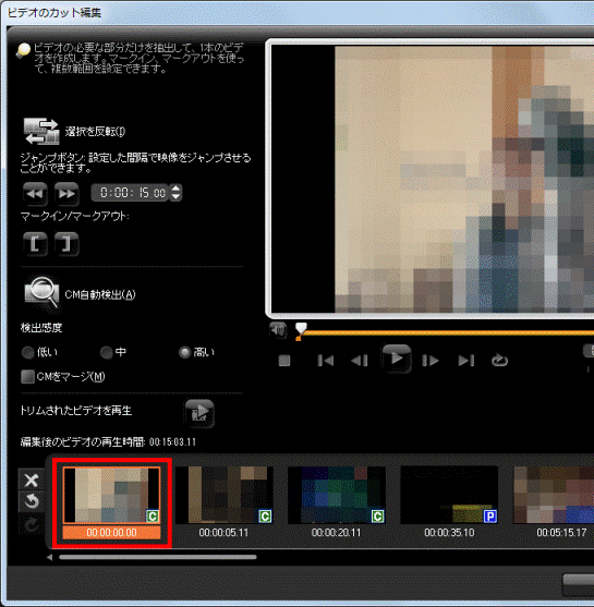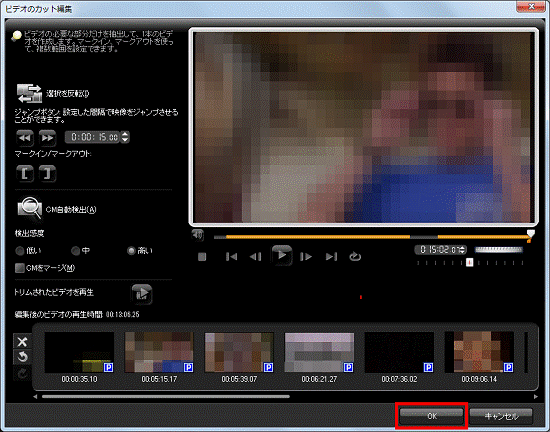 - 「ビデオのカット編集」画面の中央にある、「CM自動検出」ボタンをクリックします。