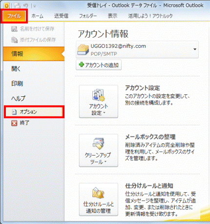 - 「ファイル」タブ→「オプション」の順にクリックします。