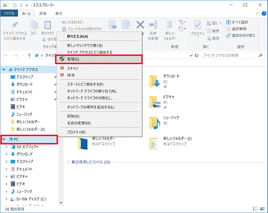 画面左側の「PC」を右クリックし、表示されるメニューから「管理」をクリックします。