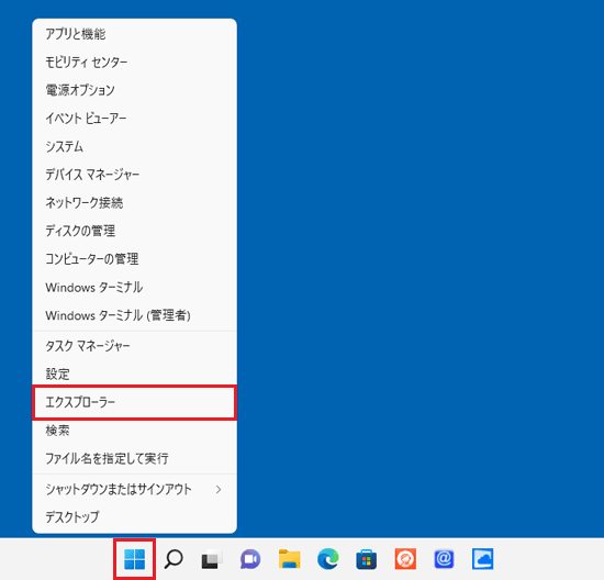 タスクバーに「エクスプローラー」アイコンが無い場合は、「スタート」ボタンを右クリックし、表示されるメニューから「エクスプローラー」をクリックします。