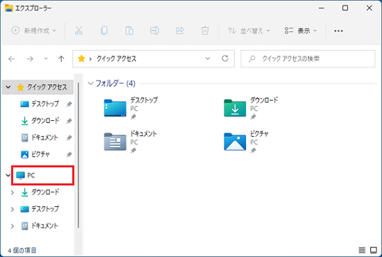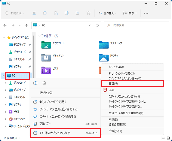 画面左側の「PC」を右クリックし、表示されるメニューから「その他のオプション」をクリックします。