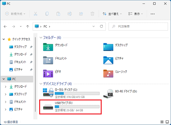 4. USBメモリのドライブレター((E:)や(F:)など)を確認します。