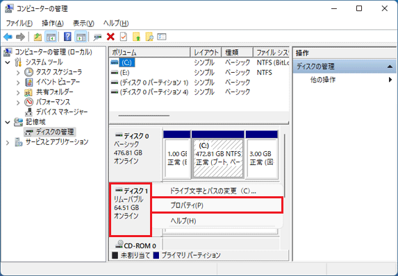 7. 手順4.で確認したUSBメモリのドライブレターの、左側にある「ディスク(数字)」の部分を右クリックし、表示されるメニューから「プロパティ」をクリックします。