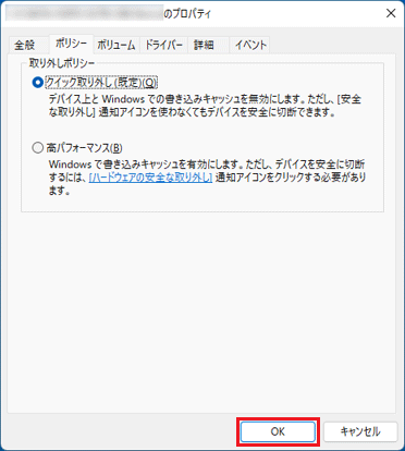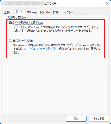 取り外しポリシーを「クイック削除」に設定した場合、USBメモリとデータをやり取りしていないことを確認してから、USBメモリをパソコンから取り外してください。