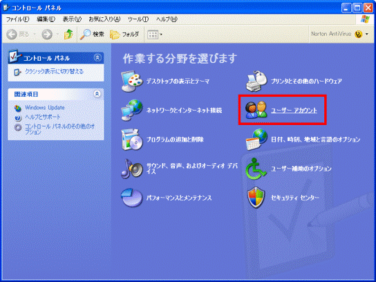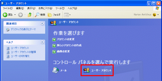 - 「コントロールパネルを選んで実行します」欄の、「ユーザーアカウント」をクリックします。