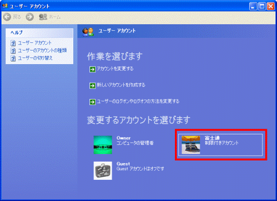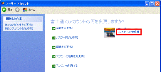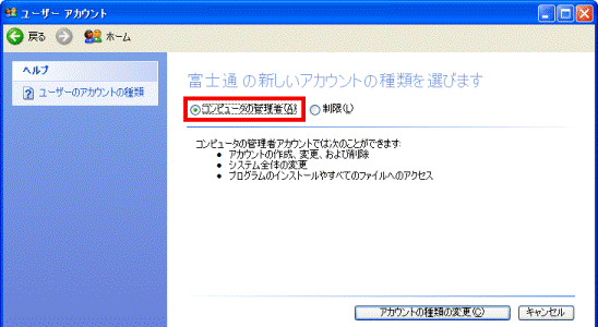 次の手順で、アカウントの種類をコンピュータの管理者へ変更します。