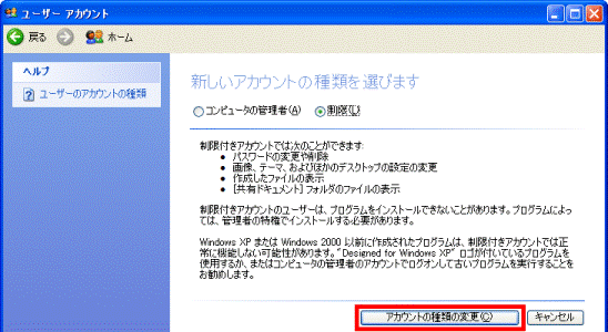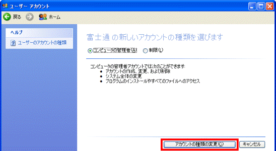 この場合は、アカウントの種類を制限からコンピュータの管理者へ変更します。