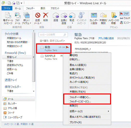 [Windows Live メール] メールメッセージを別のフォルダーに移動またはコピーする方法を教えてください。
