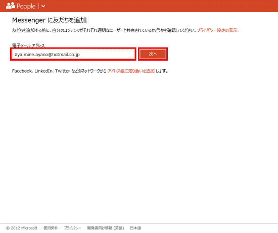 - Internet Explorerが起動し、Outlook.comの「People」が表示されます。チャットをしたい相手のメールアドレスを入力して「次へ」ボタンをクリックまたはタップします。