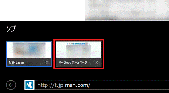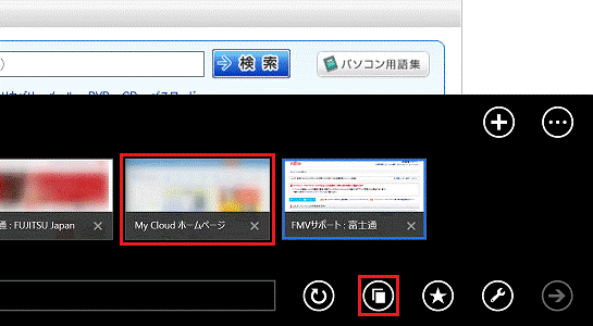 アドレスバーの右にある「タブ」ボタン(紙を2枚重ねたボタン)をクリックし、切り替えたいタブのサムネイルをクリックします。