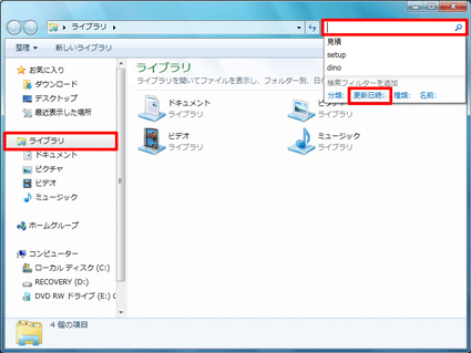 検索ボックス内をクリックし、表示されたメニューから「更新日時」をクリックします。