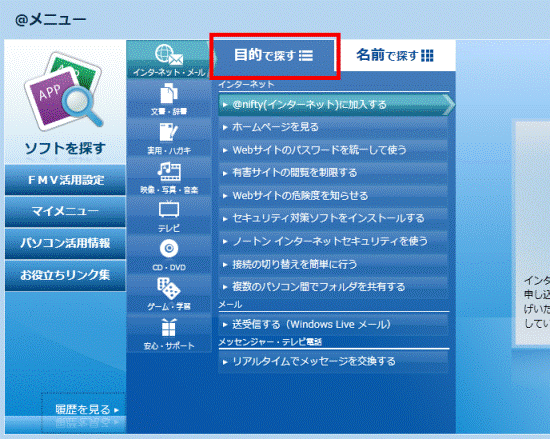 - 「目的で探す」メニューの左側に、項目が表示されます。