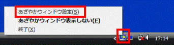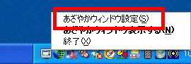 - 通知領域に表示されている「あざやかウィンドウ設定」アイコンを右クリックし、表示されるメニューから「あざやかウィンドウ設定」をクリックします。