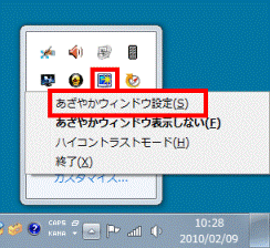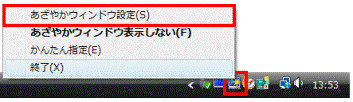 - 通知領域にある、「あざやかウィンドウ設定」アイコンを右クリックします。