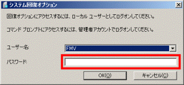 - 「回復オプションにアクセスするには、ローカルユーザーとしてログオンしてください。」と表示されます。