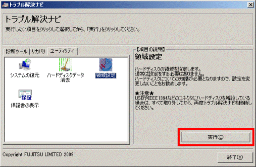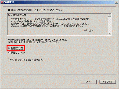ハードディスクの領域を再設定する前には必ず、必要なデータを外部メディア(CDやDVD)にバックアップしてください。