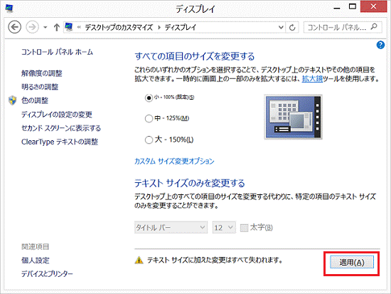(「小 - 100%(規定)」)と表示されている例アドバイス「(規定)」と表示されている項目がない場合は、「すべてのディスプレイで同じ拡大率を使用する」をクリックしてチェックを入れると表示されます。