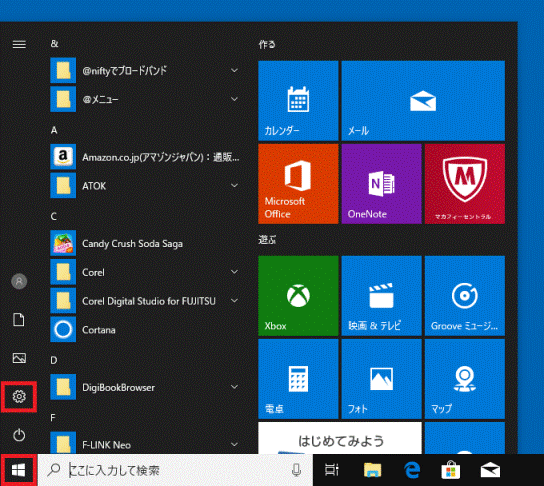 - 「スタート」ボタン→「設定」の順にクリックします。