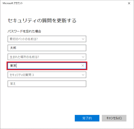 - 「セキュリティの質問3」の答えをクリックし、設定した質問の答えを入力します。