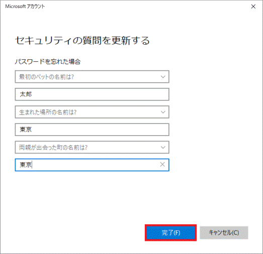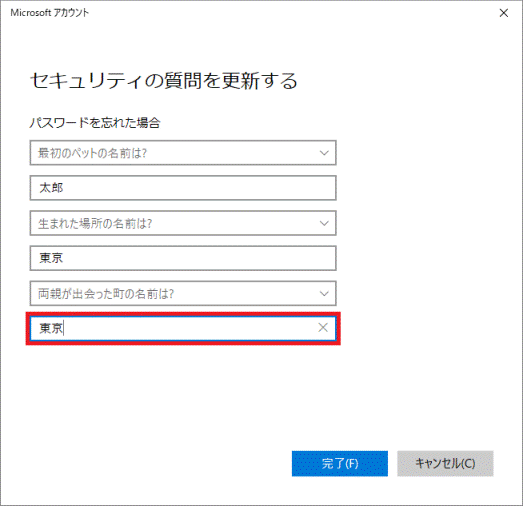 - セキュリティの質問は、Windows10のローカルアカウントのみ設定できます。