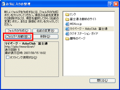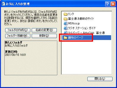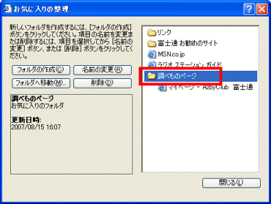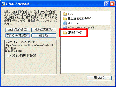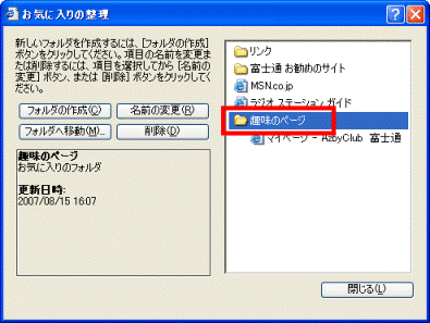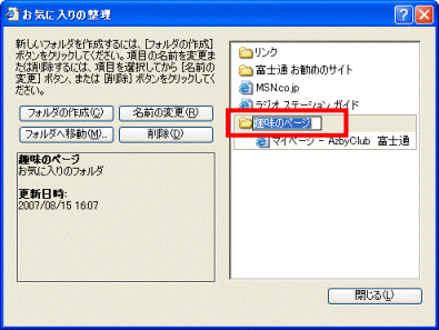 複数のホームページをフォルダーに移動する場合は、手順3.〜手順8. を繰り返します。 - 「閉じる」ボタンをクリックし、「お気に入りの整理」を閉じます。