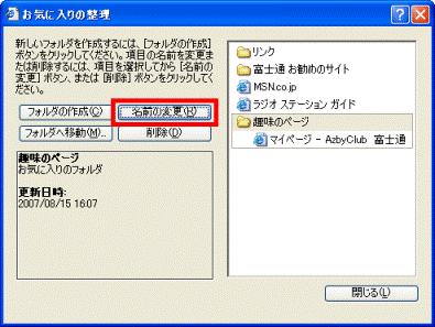 複数のフォルダー(または、ホームページ)の名前を変更する場合は、手順3.〜手順7. を繰り返します。 - 「閉じる」ボタンをクリックし、「お気に入りの整理」を閉じます。