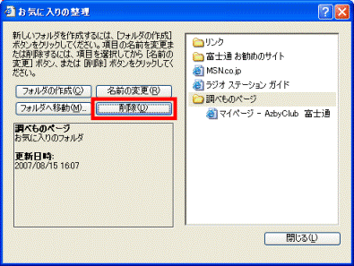 複数のフォルダー(または、ホームページ)を削除する場合は、手順3.〜手順6. を繰り返します。 - 「閉じる」ボタンをクリックし、「お気に入りの整理」を閉じます。