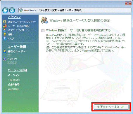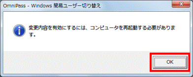 「Windows 簡易ユーザー切り替え機能を有効にする」にチェックが付いていなかった場合は、「×」ボタンをクリックし、「OmniPass コントロールセンター」を終了します。