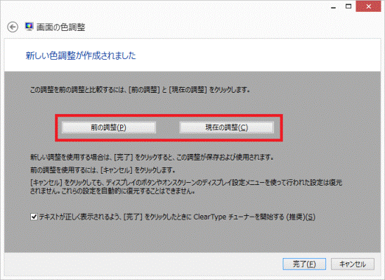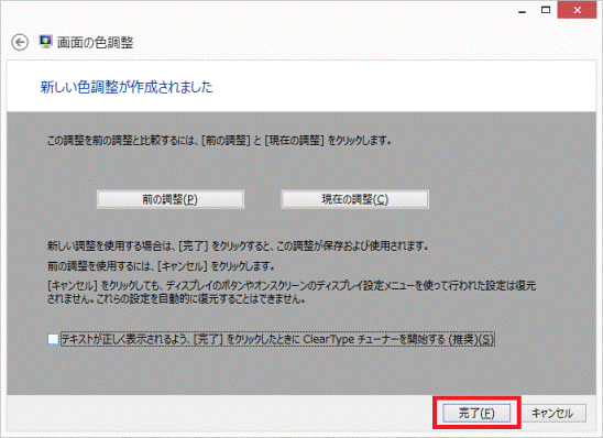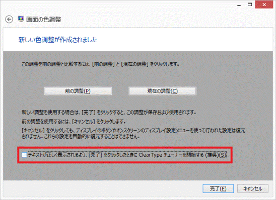 - 「テキストが正しく表示されるよう、[完了]をクリックしたときにClearTypeチューナーを開始する」をクリックし、チェックを外します。