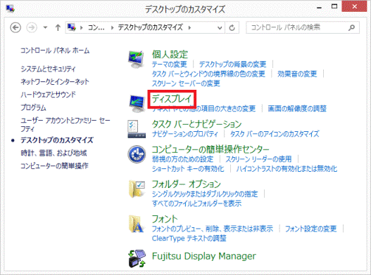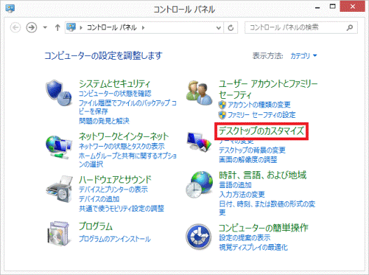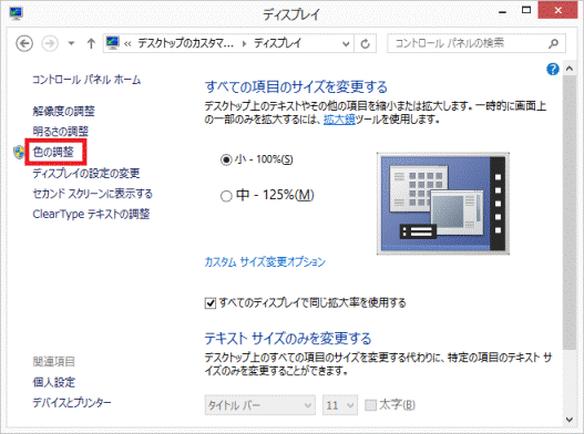 ディスプレイの色の調整は、「コントロールパネル」の「デスクトップのカスタマイズ」から行います。