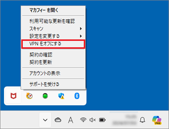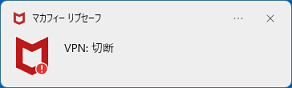 マカフィー VPNは、タスクバーの端にあるマカフィーのアイコン、またはマカフィー リブセーフの設定画面から停止します。