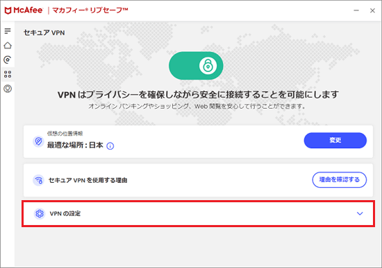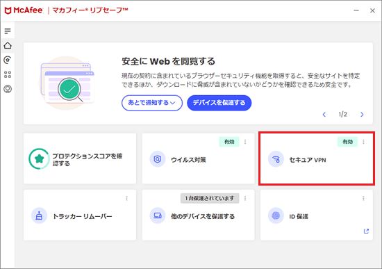 - マカフィー リブセーフをセットアップした直後は、マカフィー VPNはインストールされていません。
