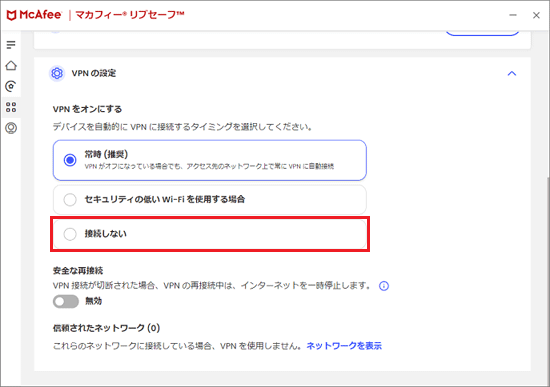 マカフィー VPNをオフにする場合は、自宅など、不特定多数の人が使用していない、信頼できるネットワークで行うことをお勧めします。