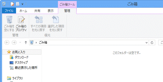 - 「ごみ箱」を開き、「ごみ箱ツール」の「管理」タブから「ごみ箱を空にする」をクリックまたはタップします。